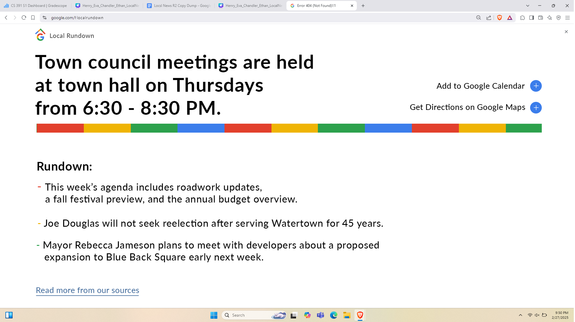 Google’s Local Rundown provides me with real-time updates on the latest developments in my local community. Simply search for your hometown, or get push notifications sent straight to your phone.